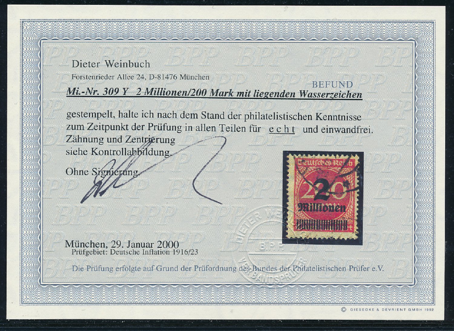 Deutsches Reich Mi.Nr.309 Y gestempelt Lux Fotobef.BPP