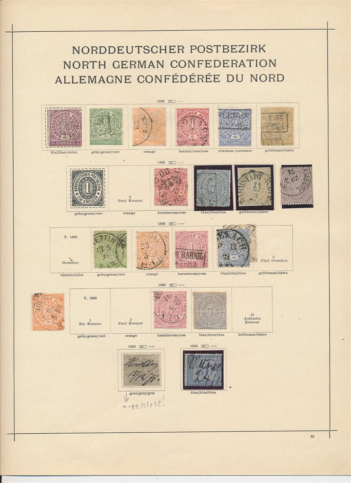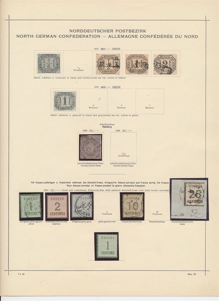 Norddeutscher Postbezirk Alte meist gestempelte Sammlung auf zwei Vordruckblättern. Achtung: Die Marken ohne Klemmtaschen sind meist fester aufgeklebt oder stärker mit Falzen befestigt und müßten vorsichtig gelöst werden. Ansonsten überwiegend saubere Erhaltung. Einiges blieb unbewertet